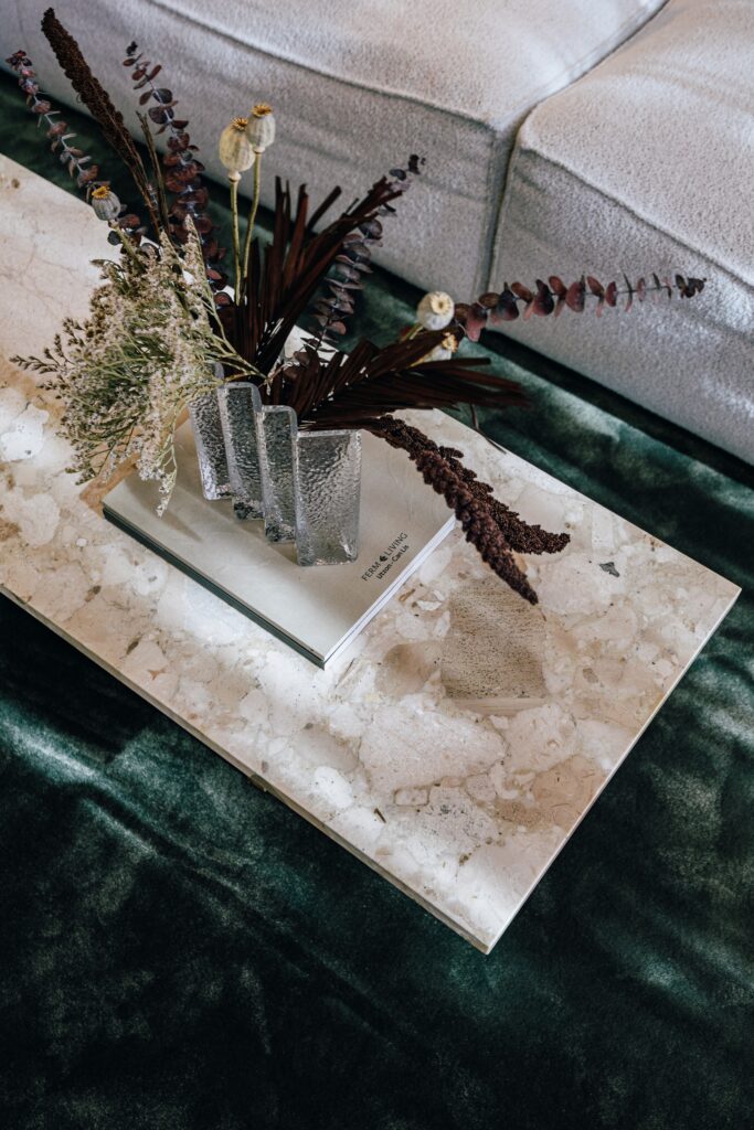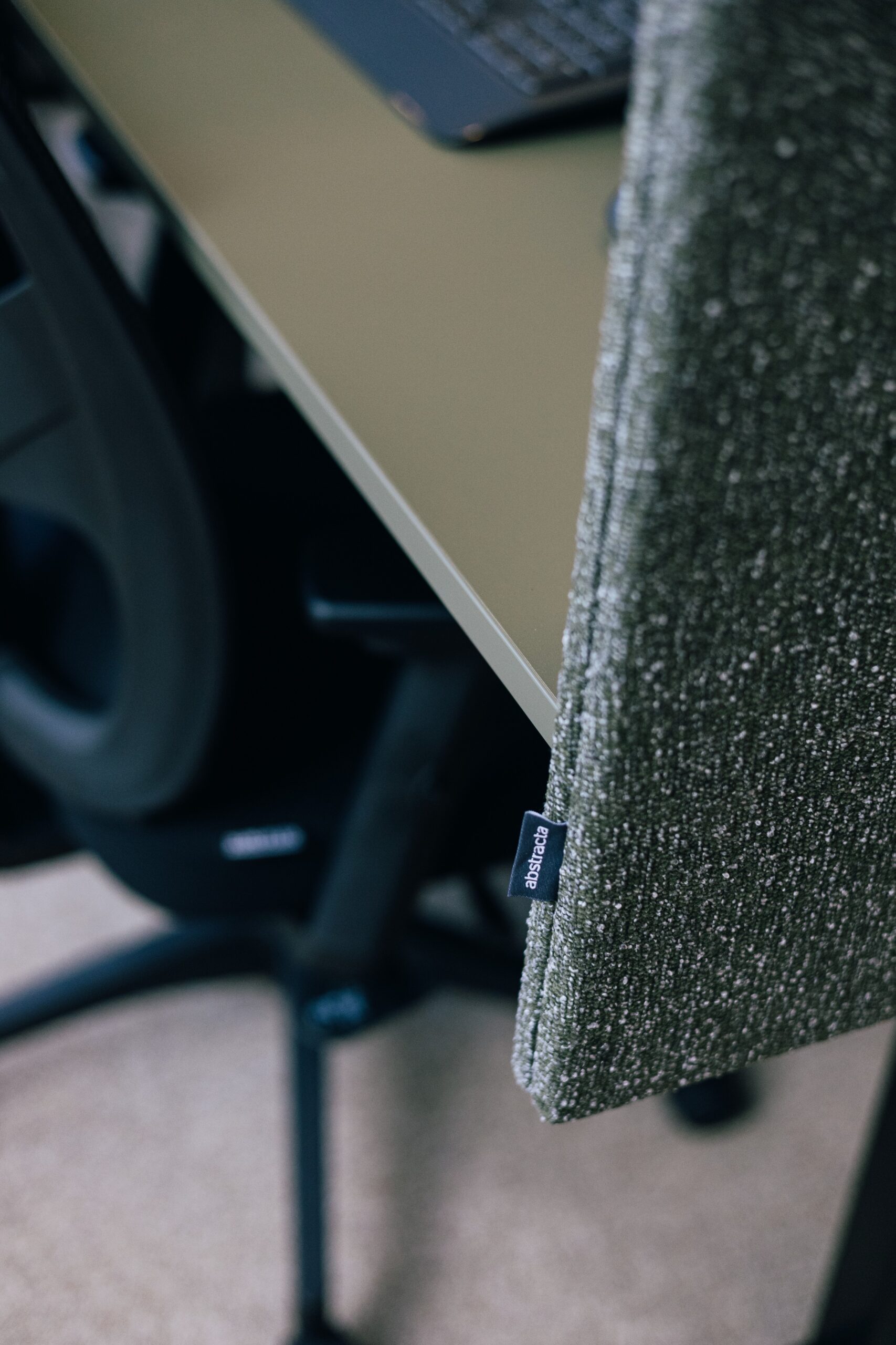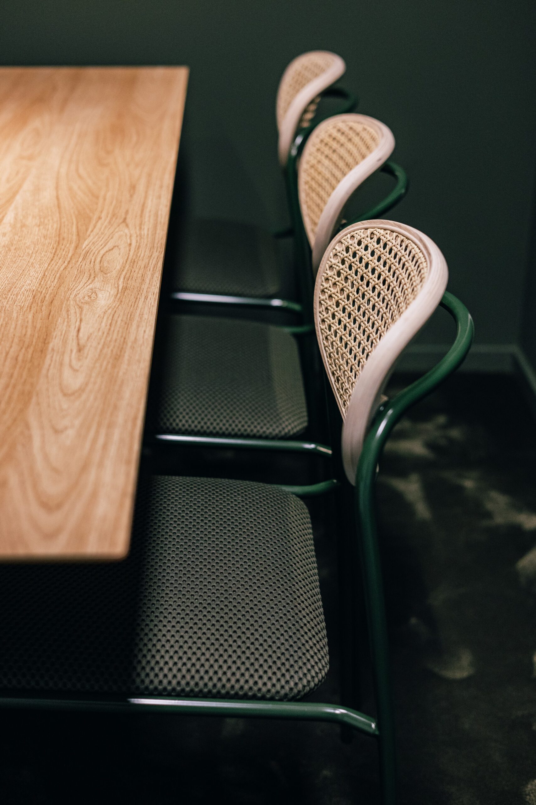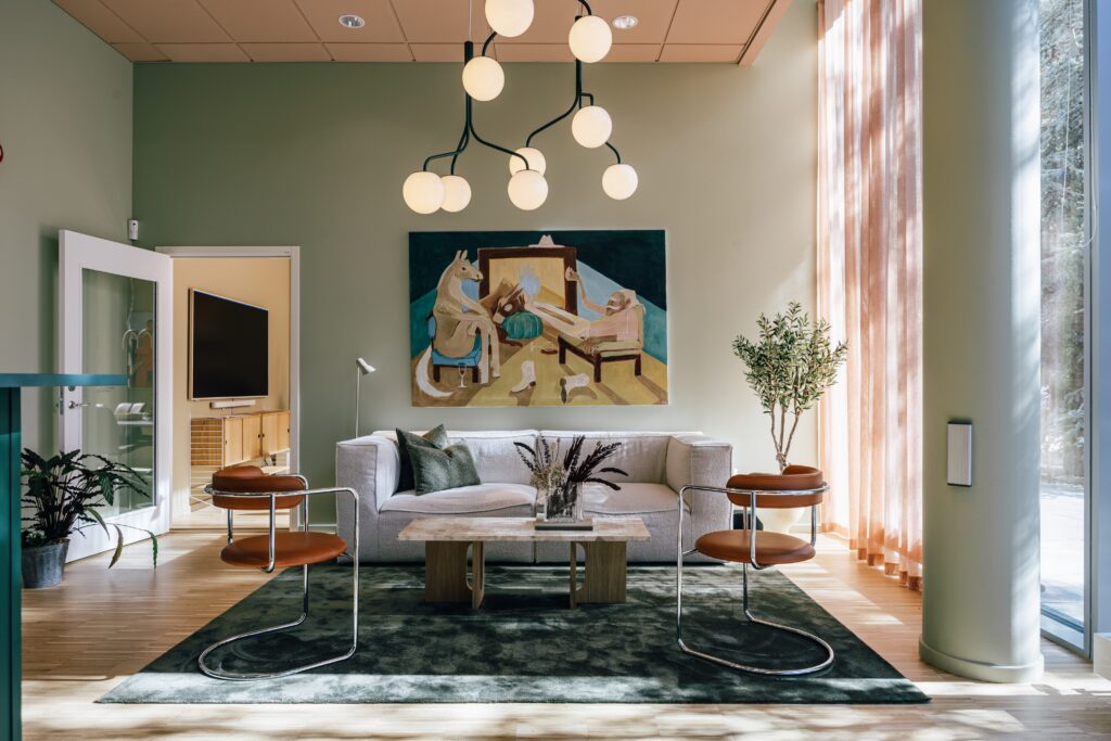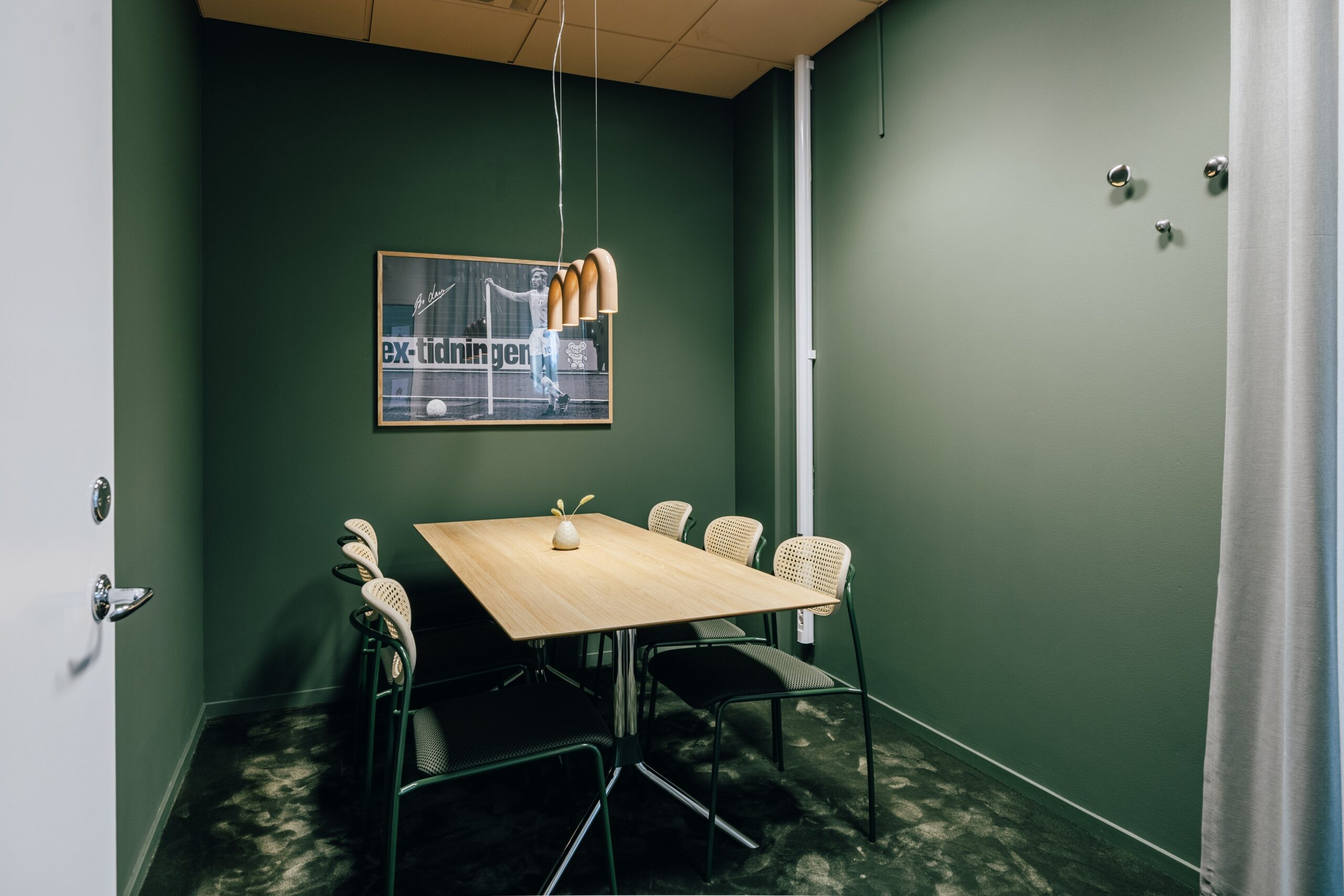 Färgpaletten rör sig i olika nyanser av grönt som möter ett dämpat rosa tonat tak. En kombination som skapar både karaktär och lugn. Tillsammans ger det lokalen ett uttryck som känns både samtida och igenkännbart, med en balans mellan det professionella och det inbjudande.