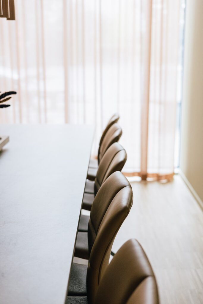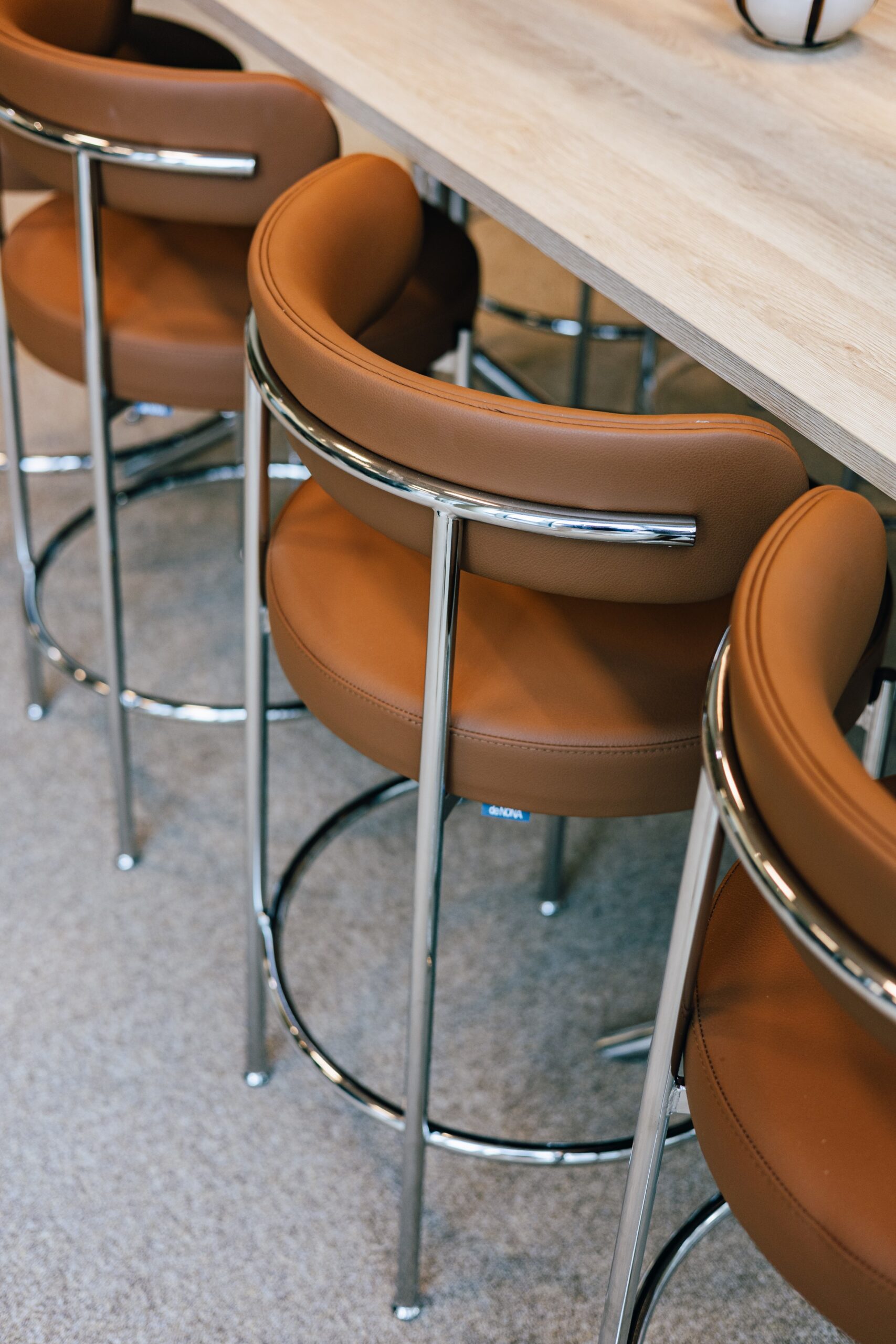 Möbleringen är noggrant utvald för att samspela med helheten. Här har vi arbetat med kontraster i material som krom, ek och brunt läder för att skapa dynamik och djup i rummen, utan att tappa den röda tråden. Varje produkt är placerad med omtanke, både utifrån funktion, flöde och visuell helhet.