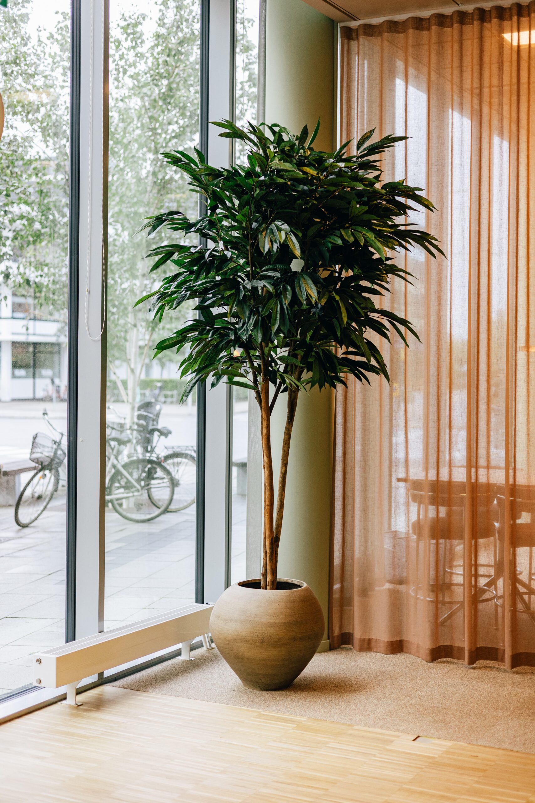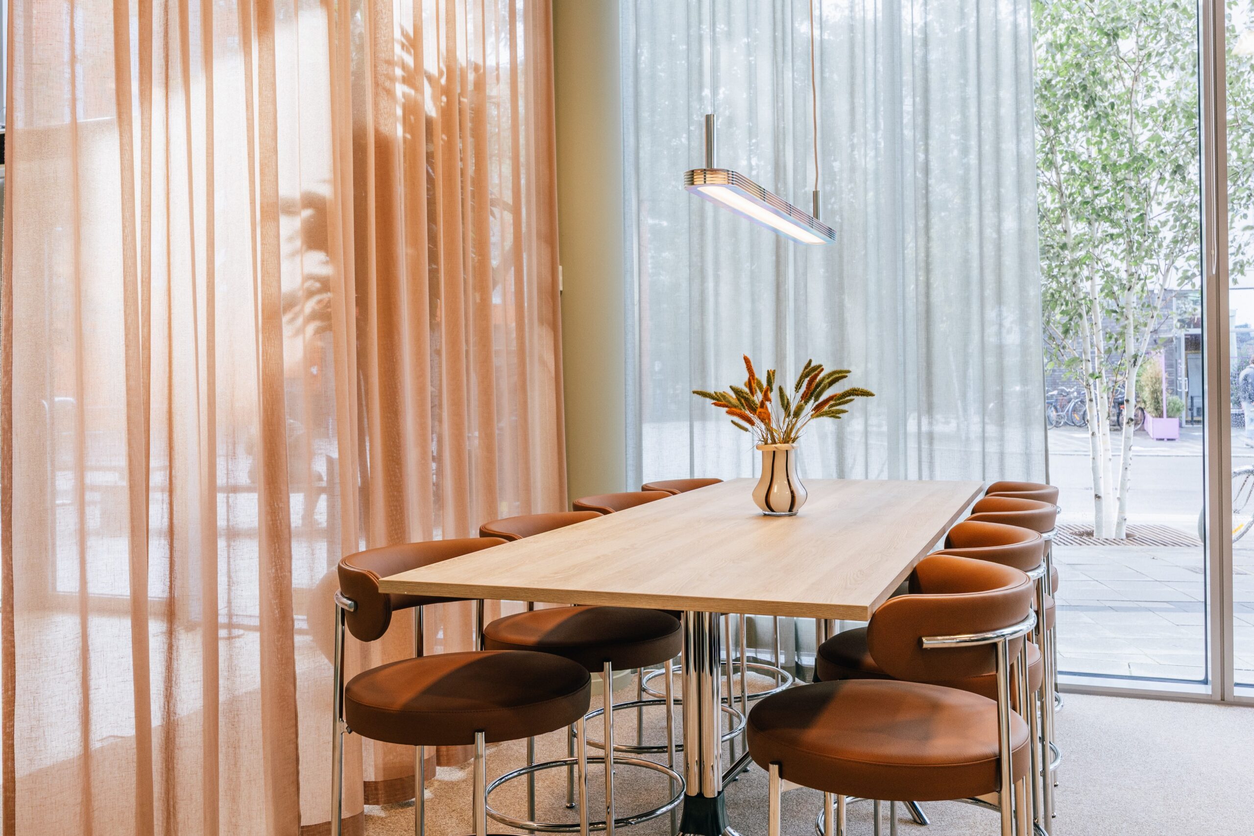 En viktig del i upplevelsen är textilierna. Gardiner, sydda i vår egen ateljé, ramar in lokalen och bidrar med en mjukhet som balanserar de hårdare materialen. Samtidigt fungerar de som en sammanhållande komponent i färgsättningen och förstärker helhetskänslan i varje rum.